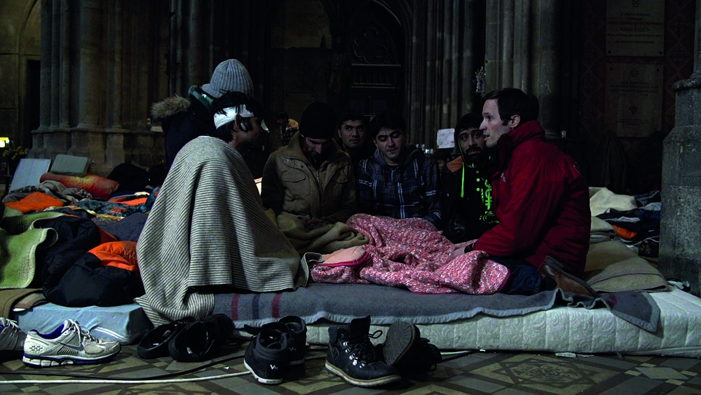 50 Afghani and Pakistani refugees occupied one of the biggest churches in Vienna to protest against negative decisions in their asylum applications. This would send them back to a region where the Taliban kill people every day and US drones fly. Detention and deportation split them up again during the following months. Now only twelve of them left over. Desperately they are looking for new shelters and fighting for a improvement of the EU asylum system.